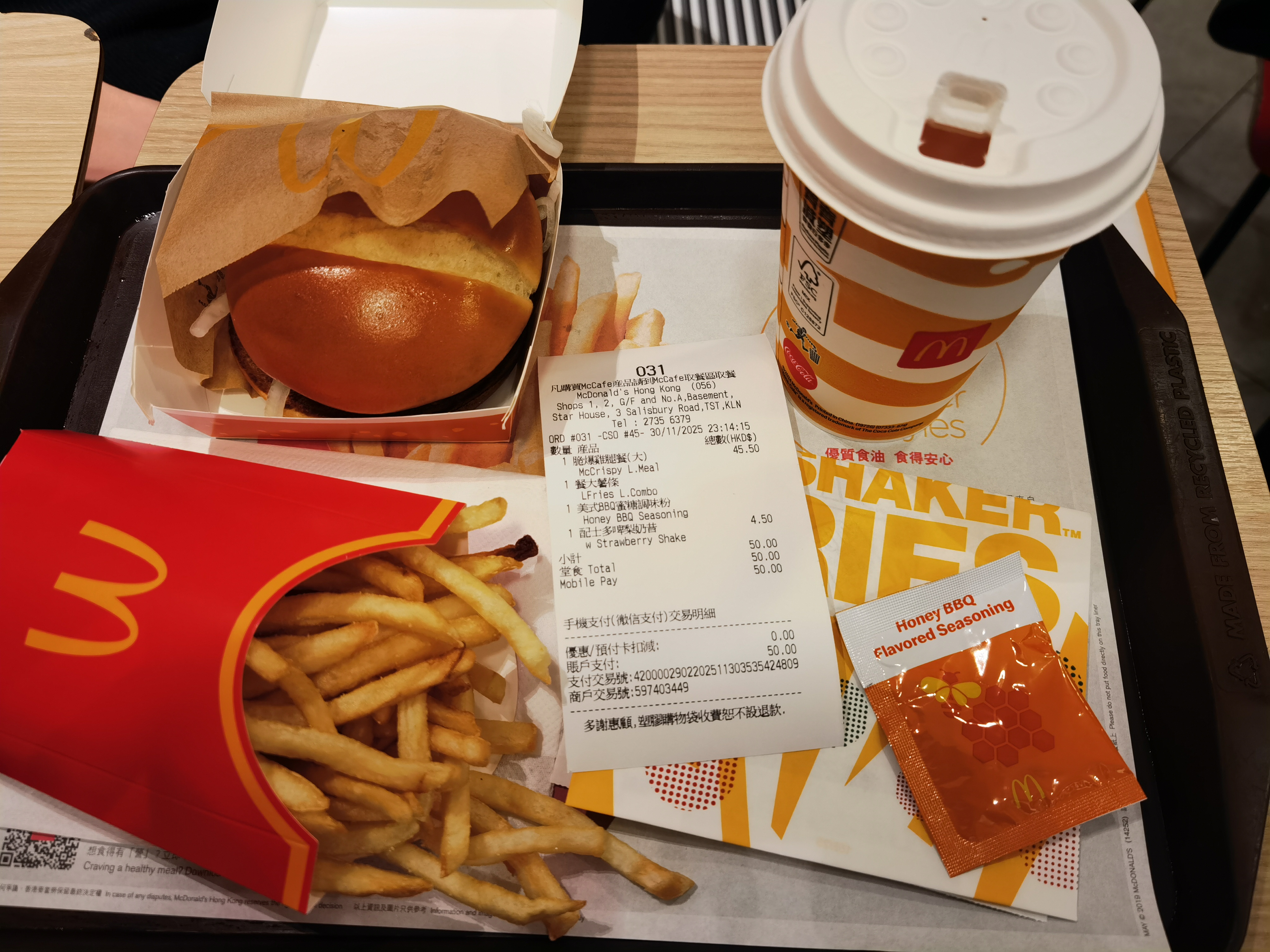 下船后我们直奔旁边的麦当劳,其实这也是此行的一个任务——体验香港的麦当劳。在花费 30 分钟折腾 App 后决定在点餐机上点餐。早在社交媒体上听说内地的麦当劳和香港的不一样,事实也的确如此,香港的小薯相当于内地的中薯,而且吃法是将粉包和薯条一起倒进一个纸袋里 shake,与内地蘸番茄酱的吃法也略有差异。