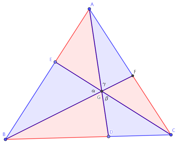 若AD,BF,CE三线共点,则三个红色三角形面积之积等于三个蓝色三角形面积之积。