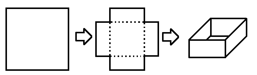 给定一张边长为 的正方形纸,在四个角落各剪一个边长为 的小正方形,拼成一个无盖长方体,请输出这个长方体体积最大时的体积、高和底面边长(保留 5 位小数).